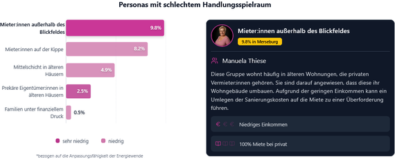 Je finanzschwächer ein Haushalt, desto anfälliger ist er für Energiepreisänderungen. Typische Gruppen sind zum Beispiel ältere Renter:innen, die im eigenen schlecht gedämmten Häuschen leben und kein Geld für die Sanierung haben. Oder Mieter:innen bei Privatvermietern, denen hohe Heizkosten drohen, weil die Vermieterin keinen Anreiz für eine Sanierung hat.
