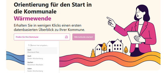 Von Aach bis Zwickau findet jede einzelne der 11.000 Städte und Gemeinden in Deutschland im WärmeGuide maßgeschneiderte Schritt-für-Schritt-Anleitungen, Zukunftsszenarien und Handlungsempfehlungen für eine effiziente Wärmeplanung.